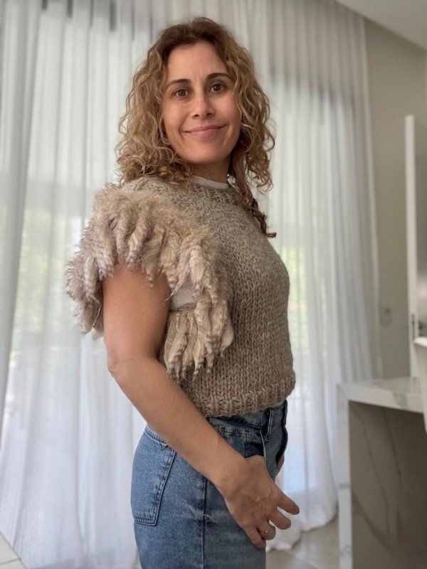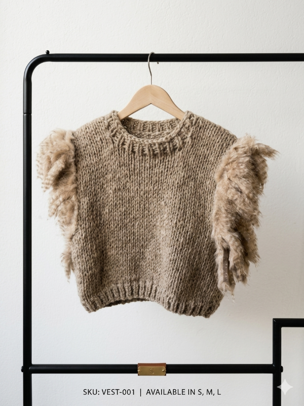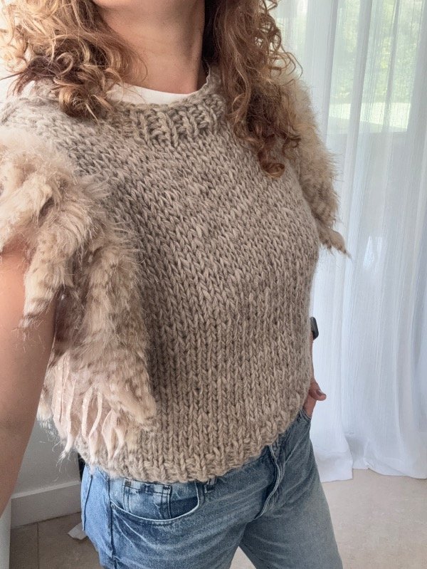 Chaleco tejido a mano con lana pura natural Meriland. Su diseño se destaca por el detalle de la piel sintética y lo hace que destaquen los hombros, que aporta textura y personalidad a una prenda única.